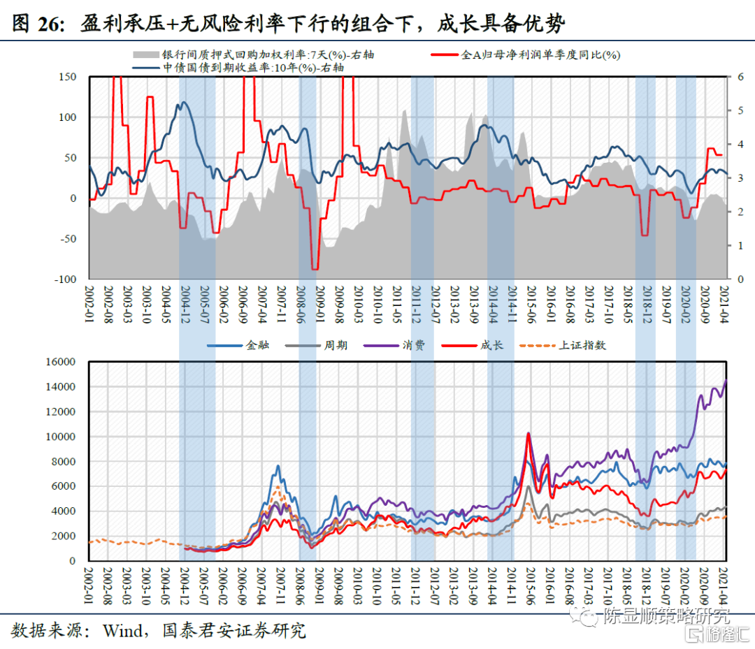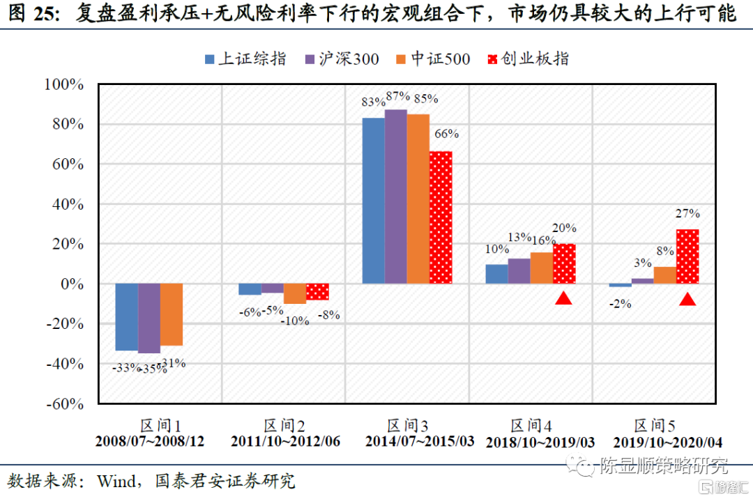 复盘盈利承压+无风险利率下行的宏观组合。前文所述,我们认为本轮经济修复的节奏是,越往后压力会越大。考虑到盈利承压以及由此可能的无风险利率下行的宏观组合,以全A归母净利润单季度同比作为盈利增速观测指标,以月度平均的十年期国债利率+银行间质押式回购利率(7天)作为无风险利率观测指标,我们选取了历史上最近的五段区间: