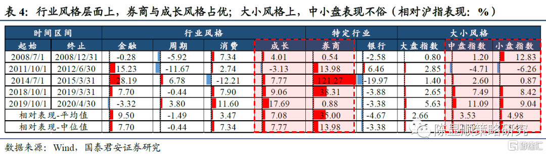 行业风格层面上,券商与成长风格占优;大小风格上,中小盘表现不俗。具体来看,行业层面:1)相对表现的胜率上,成长风格录得正向超额收益的概率达80%。2)相对表现的数值上,成长与金融的中位值分别为7.77%与7.70%;其中,金融中的券商行业表现尤其突出,在相对胜率100%的情形下,相对表现的均值与中值分别为35.00%和13.98%,成为引领资本市场的龙头板块。大小层面:中小盘表现不俗,相对表现的均值分别为3.53%和4.98%,尤其是2014年以来的三轮行情中,中盘风格更为优异。