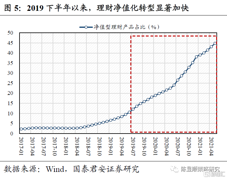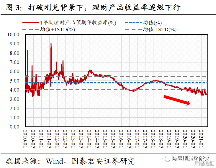 资管新规打破刚兑背景下,银行理财跌破净值带动无风险利率下行。2018年以来,无风险利率的锚定转化为银行理财产品的预期收益率,而2020年疫情后银行理财产品出现了预期收益率下行且破净的情况,寻找新资产的动力正在酝酿。2020年7月,1年期银行理财产品预期年收益率下降至3.92%,突破2016年中的低位。2020年12月,永煤事件冲击下信用利差扩大,银行理财产品预期收益率进一步下降,带动无风险利率下行。