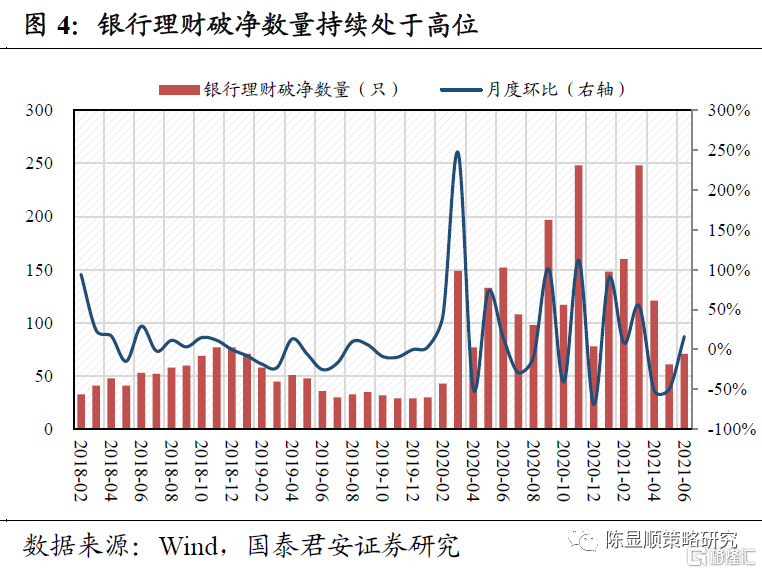 没有预期内的“紧”,但有预期之外的“松”。我们看到的是,2021年H1在投资者普遍对宏观政策“紧”的预期下,从成交规模和换手维度看A股市场流动性意外的充裕。这其中有一个重要的微观基础在于,理财刚兑的打破以及地产市场的限制,使得居民已缺乏易获得性的高收益的资产,而在通胀的压力下居民的持币意愿也在减弱,对资产的需求在提升,尤其是我们能够看到权益类的资产获得了较大的净流入。这是一个中期变化的趋势,无风险利率的下行,推动了居民增配股票资产。进而,使我们看到了宏观政策与股票市场微观流动性之间的一个分离。