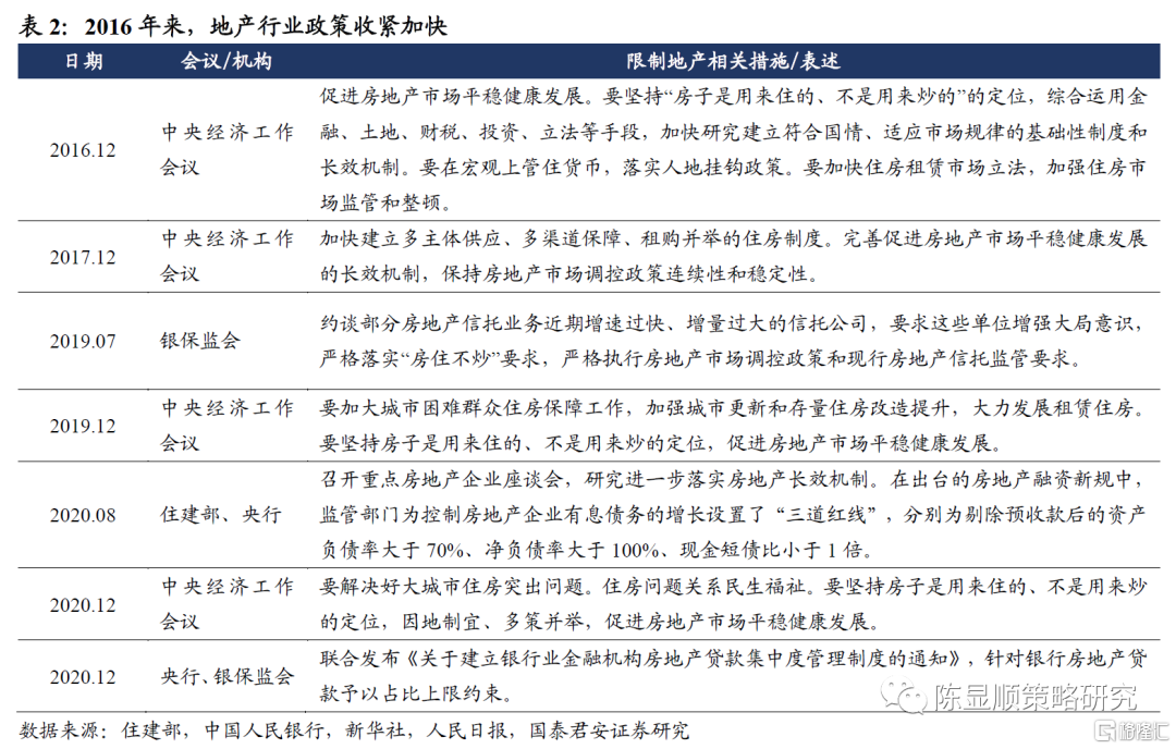 “房住不炒”提出以来,房地产行业在政策层面上受到明显压制。2016年底,中央经济工作会议首次提出,“房子是用来住的,不是用来炒的”。此后,相关部门陆续出台与之相配套政策,涉及到房企融资、购房信贷等诸多领域。一方面,地产企业在融资端表现为持续收紧,如2019年7月银保监会约谈房地产相关的信托平台。另一方面,居民购房端限制提升,除了一系列限购之外,信贷投放亦显著收紧。其中,2020年12月31日,央行联合银保监会发布《关于建立银行业金融机构房地产贷款集中度管理制度的通知》,针对银行房地产贷款予以占比上限约束。