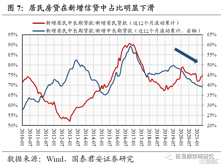 信贷的结构上,新增居民贷款当中的中长期贷款占比下滑侧面说明了地产的“虹吸效应”逐步削弱。从当前新增信贷的结构来看,居民端中长期新增信贷金额2017年来持续下滑,中长期信贷占居民贷款比例由91%下滑至74%,新增居民中长期贷款占全部新增贷款比例由59%下滑至39%,且仍有持续下滑趋势,反映了更多中长期资金从“地产信贷”当中转移至实体企业当中,以往地产的“虹吸效应”在本轮信用扩张周期当中减弱,地产在信用周期中的低位逐步下行。