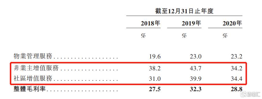因此,伴随着非业主增值服务及社区增值服务两大业务合计收入占比从2018年的42.8%提高至51.1%,支撑公司整体毛利率维持在较高水准。