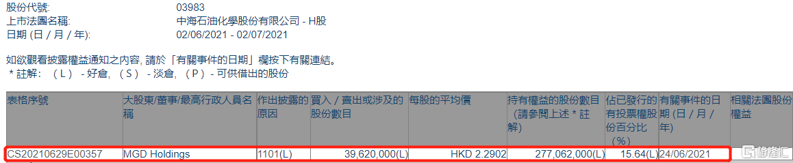 中海石油化学(03983.HK)获MGD Holdings增持3962万股
