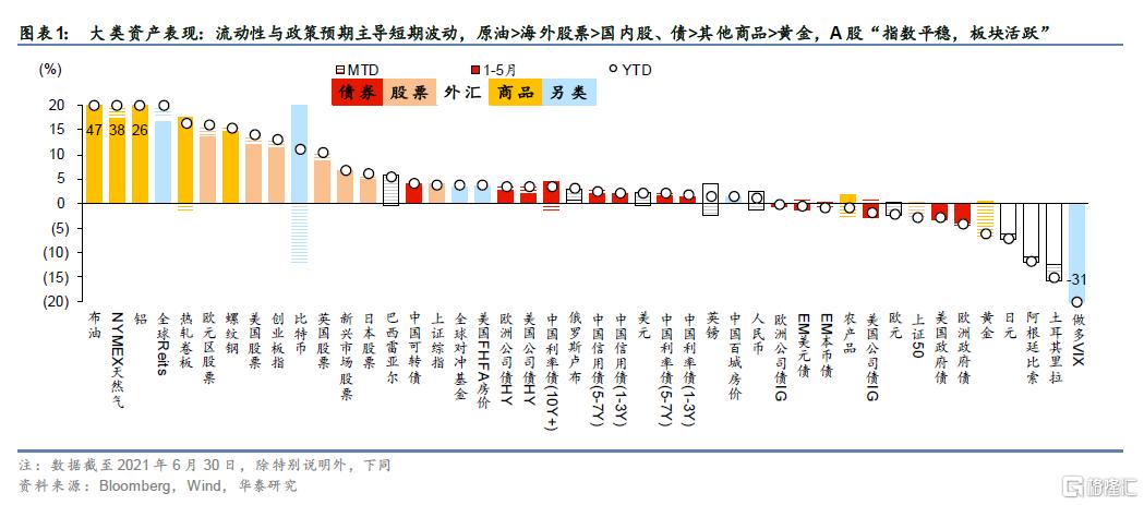 6月份,全球PPI继续走高,美联储边际转鹰降温大宗商品,再通胀预期迎来扰动,海外股强债不弱。国内经济数据整体平稳略偏弱,流动性和政策预期主导了短期市场波动,但股债整体仍维持震荡格局。6月以来,疫情方面虽有广东等地零星新闻冲击,但市场关注度明显降低。全球PPI都明显走高,但相比低基数效应带来的高预期水平,“超预期”部分反而显得无足轻重,反而是流动性与政策预期主导了短期国内外市场波动:美联储FOMC传递出偏鹰派信号,美元反弹降温大宗商品,再通胀预期迎来扰动反而阶段性支撑了美债,进而稳定了美股估值。国内社融等宏观经济数据整体偏弱、PPI创2009年以来新高,但市场对基本面数据反映平淡,债市对资金面及央行表态、永续债政策风向、天津债券恳谈会等政策面因素更敏感,股市则维持“指数平稳、板块活跃”的态势,逻辑更顺的周期板块与受益于无风险利率平稳的成长板块表现更为突出。