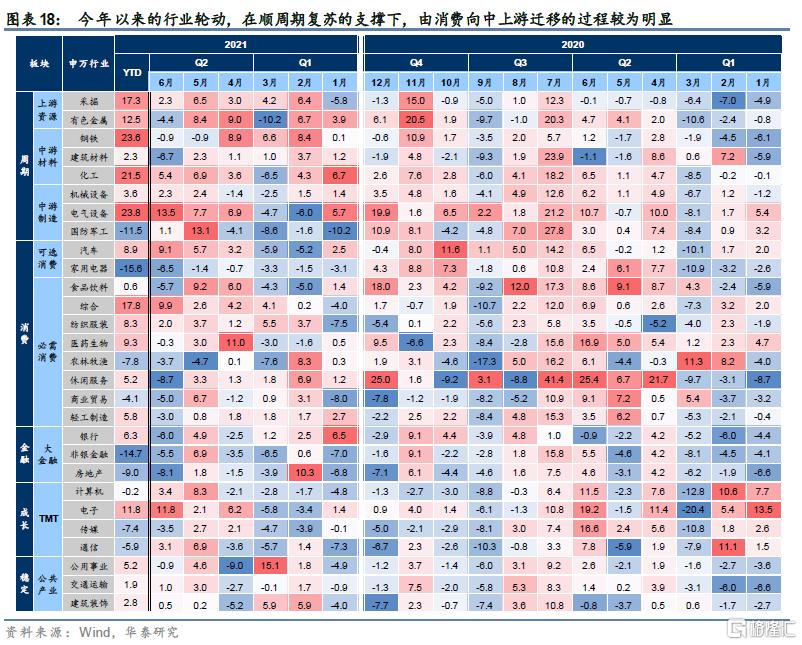 宏观流动性趋稳,但居民部门等再配置需求仍强,A股盈利与估值较难形成共振,自下而上把握轮动机会是更适宜的操作思路。下半年可能出现的美联储taper QE或影响全球宏观流动性,国内货币政策预计在复苏深化的背景下也继续以稳为主。房地产调控、大额存单利率降低、货基利率下行到2%甚至以下,居民部门存在再配置压力。今年房地产三道红线、地方隐性债务约束等产生局部信用收缩效应,导致债券机构普遍缺优质资产,场外资金并不缺。但A股近20年来没有连续三年拉整体估值的规律或仍将持续,换言之不具备演绎指数行情的基础。在这一背景下景气度与业绩匹配较好的行业更容易凝聚资金共识,能够在逐步验证业绩的过程中维持估值基本稳定,进而获得较好回报。