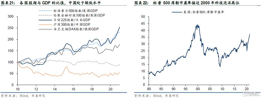 新冠疫情危机期间,各国央行纷纷采取宽松货币和财政政策,美股流动性充裕的环境下屡创新高,但是各类资产已不便宜。我们用全球主要股票指数近似股市总市值,股指与同期名义GDP的比值可以反映股市的估值情况。纵向来看,2020年以来美股估值大幅上行,用标普500席勒市盈率指标也可以佐证这一点。横向来看,沪深300与中国GDP比值反应的股市泡沫风险相对较小。