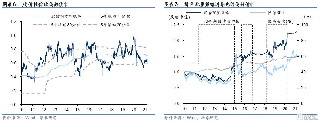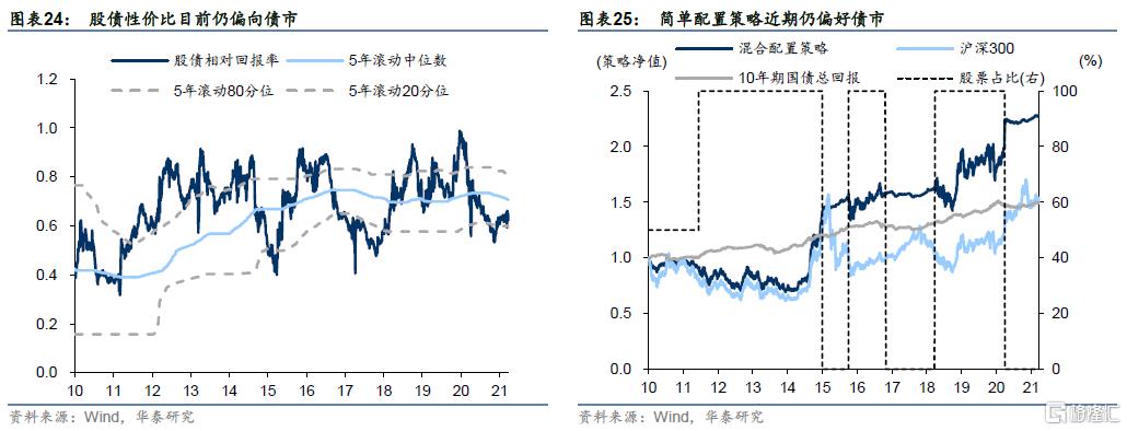使用股债相对性价比指标进行回测验证,使用这一直观的指标构造出策略:1、期初,股、债占比均为50%;2、>80分位数,全仓沪深300;3、<20分位数,全仓10年期国债。这样一个简单的兼顾“估值”和“惯性”的策略,在2010年以来的回测中已经明显跑赢了单一资产类别。简单配置策略目前仍出于“惯性”偏好债市,且估值信号也向债市倾斜。