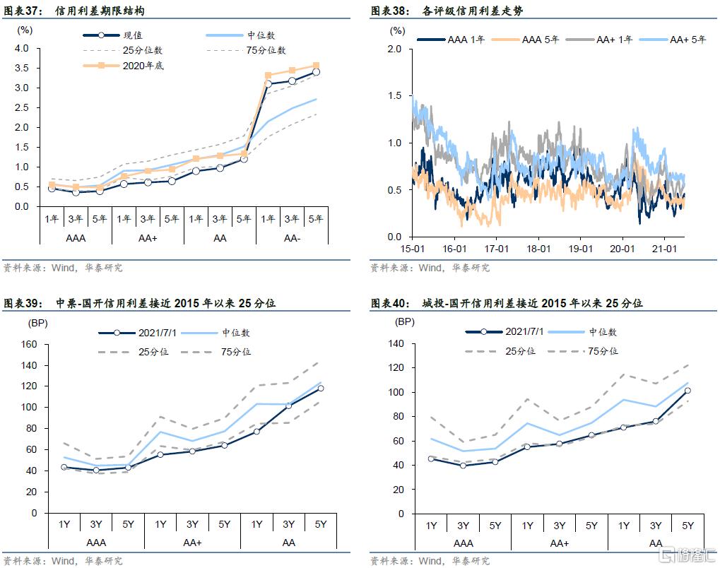 2)债市调整后短端利率重回2002年以来的中位数附近,长端利率处于较低分位附近。信用债得益于欠配压力等,中高等级信用债尤其是短端,无论是收益率还是信用利差都位于历史低位。需要注意的是,我国处于经济转型期,增长中枢也处于下行中,收益率历史分位数不能简单参考;