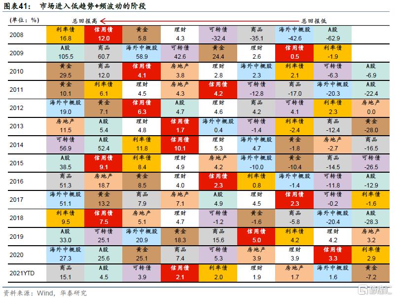 去年以来,“美林时钟”看似短暂回归,市场交易的重心变化是确定性-复苏-再通胀,市场经历了现金-债-股-黄金-大宗完整轮动。2020年上半年在疫情冲击下,全球经济活动放缓、价值链受限,国内外货币、财政政策快速放松,基本面和货币政策双驱动下,债市走牛。5月以后国内疫情、经济、政策拐点出现,货币政策向常态回归,债市转熊,股市、商品等自3月低点修复后表现突出。2021年春节以来,股市的流动性驱动被业绩验证行情取代,资金由抱团白马向中小盘股票扩散,市场风格明显切换,全球错位复苏带来短期供需失衡,叠加产业政策助推了大宗商品快速冲高行情,而后随着全球疫情恢复与美联储货币政策收紧预期增加而逐渐降温。单从资产表现来看,美林时钟理论在我国实践中又奏效了。