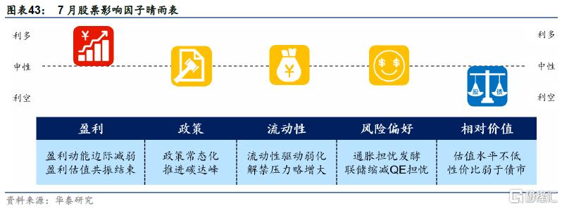 股市三季度缺乏更有利的共振,各因素还不差但难形成做多合力。盈利驱动仍在但动能边际减弱,流动性有支撑但短期面临年中大考+解禁挑战、中期又有国内外通胀制约,风险偏好已经从有利渐渐转向中性。我们认为,当下股市操作空间进一步被压缩。操作方面,从积极寻找结构性机会转为寻找个股机会,对主题型机会看短做短、对优质赛道则依托估值和中报业绩寻找机会,价值品种仍处于左侧,市值因子上中盘>大盘>小盘。