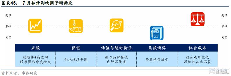 股市预期支撑渐弱、转债供求继续平衡,预计转债估值保持稳定但要提防大盘银行品种的集中冲击。但就核心品种而言,转债估值已经不便宜,可依托中报预期做增减操作。另外,高性价比品种数量继续减少,从该比例的择时意义上看也应适当转向防御操作。我们重申当下转债仓位可以小幅降低,突破口主要还是定位合理的优质新券,其次可寻找基本面不差的高性价比存量品种。与股市相似,三季度也将更倾向于自下而上寻找个券机会。