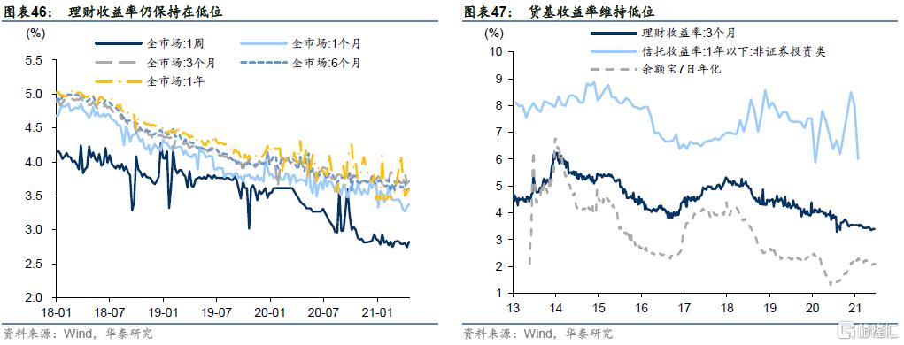 3)理财等相比2004年以来的历史水平还有一定吸引力,但也在下降,且在理财净值化持续推进的背景下,净值波动率成为了理财的新考察维度,吸引力总体下降趋势可能难改。尤其是现金管理新规之后,该类产品相对货基的收益率必然会逐步收窄,相对优势减弱。货基收益率仍位于2004年以来低位附近。
