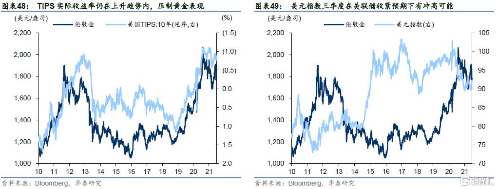 2、美元美元随着6月FOMC释放偏鹰派信号而转为震荡偏强,压制黄金表现,但实际上市场price in下半年缩减QE讨论的程度仍不充分,中期看仍是黄金价格的风险点;