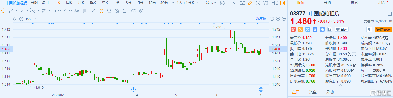 格隆匯7月5日丨中國船舶租賃(3877.HK)股價震盪拉昇,現漲5%,報1.46港元,最新總市值89.6億。光大證券指,隨着近期航運市場的好轉,船東對於提升運力的需求大幅提升;“碳達峯、碳中和”、脫硫、脫氮等環保要求對於可替代清潔能源的需求,以及對船舶自身環保要求不斷提升,這些因素有望使公司利潤水平持續、快速地增長。通過相對估值,公司2021年PB低於可比公司平均水平,首次覆蓋給予公司“買入”評級。