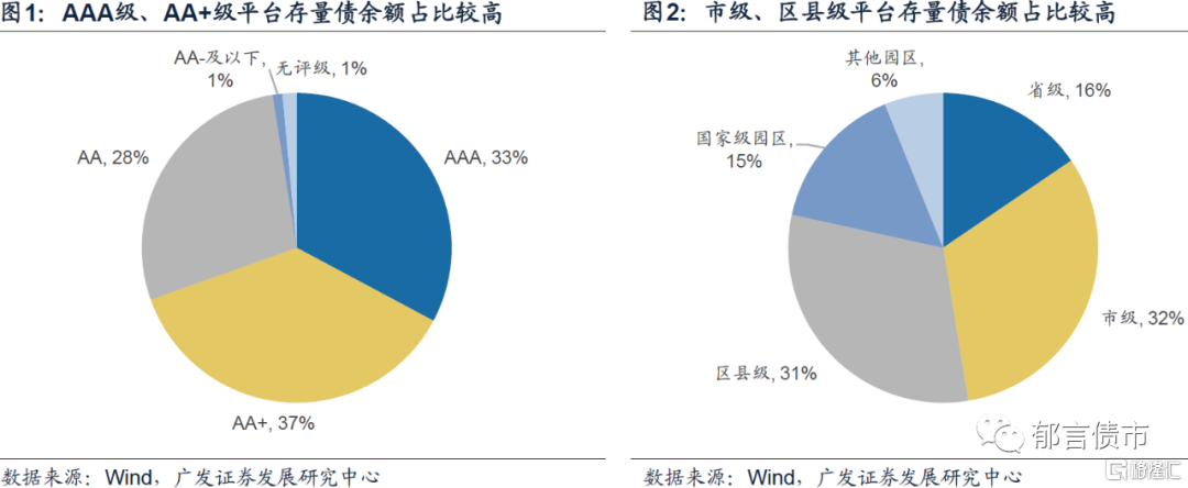 发债城投平台存量债余额为121324亿元。分主体评级来看,AAA级、AA+级平台存量债规模较大,两者合计占比达69.6%,其次是AA级,占比为27.9%,AA-级及以下和无评级平台存量债余额占比合计仅2.5%。分行政级别来看,市级、区县级平台存量债余额占比均在30%以上,省级平台占比为15.5%。