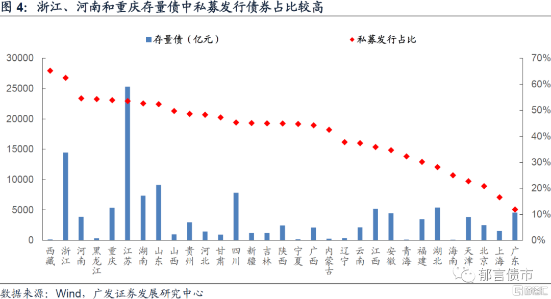 存量债分省份看,江苏、浙江存量债规模位居全国前列,均在10000亿元以上。而宁夏、西藏、青海、海南存量债规模较小,均在200亿元以下。从私募发行城投存量债占比来看,西藏排第一,占比为65.2%,主要系拉萨市城市建设投资经营有限公司存量私募债规模较大,共90亿元;浙江次之,占比为62.5%;河南、黑龙江、重庆、江苏、湖南和山东占比也超过50%。而上海、广东私募发行城投债占比较小,均在20%以下。