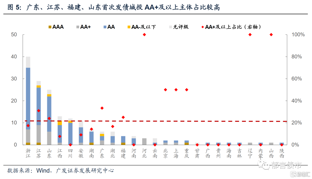 2021年首次发债城投平台分省份看,主要分布在全国25个省份及直辖市。其中浙江、江苏、山东首次发债城投数量居全国前三位,分别为40家、29家和25家;江西、四川、安徽首次发债城投数量介于10-15家之间;其余省份首次发债主体数量均未超过10家。其中,广东、江苏、福建、山东主体资质较好,AA+及以上占比均位于20%以上,而四川、河南等10个省份首次发债主体均为AA+以下。