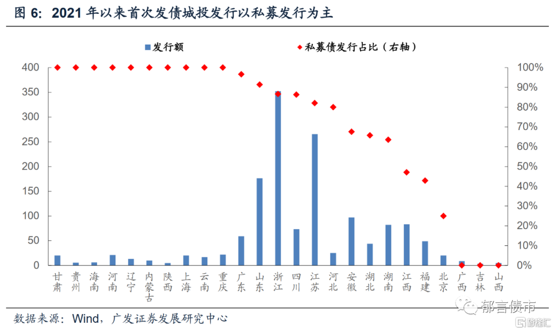 发行额分省份看,浙江、江苏和山东2021年上半年首次发债城投发行额相对较大,均在150亿元以上。且这些省份均以私募发行为主,私募发行占比均在80%以上。除江西、福建、北京、广西、山西、吉林外,其余省份2021年上半年首次发债城投私募发行占比均在50%以上,其中甘肃、贵州、海南等10个省份占比高达100%,不过这些省份发行额较小,均不超过25亿元。