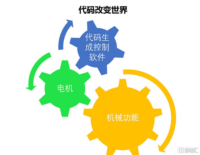 用纯机械来实现组合机械功能难度异乎寻常的大,那不妨换一条路径。用代码生成控制软件,通过操作电机驱动机械来实现各种机械功能。这样就将复杂的机械功能转换变成几行代码的写作,难度下降了N个数量级。