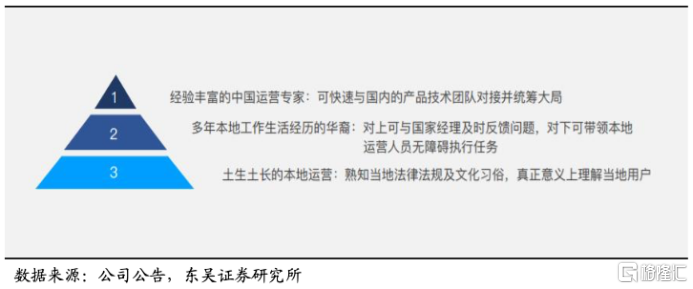 其二,本地化运营。基于多地语言、文化的复杂性,本地化能力迄今为止仍是出海竞争的主要难题和决胜因素。赤子城科技在十余个国家和地区都有本地化团队,独创金字塔式三层人员架构。其招募熟知当地法律法规及文化习俗的本地运营的同时,配备经验丰富的中国运营专家以及具有多年在本地生活经历的华裔,并与当地政府保持良好沟通,保障新创及原有产品的有效推广、优势巩固。