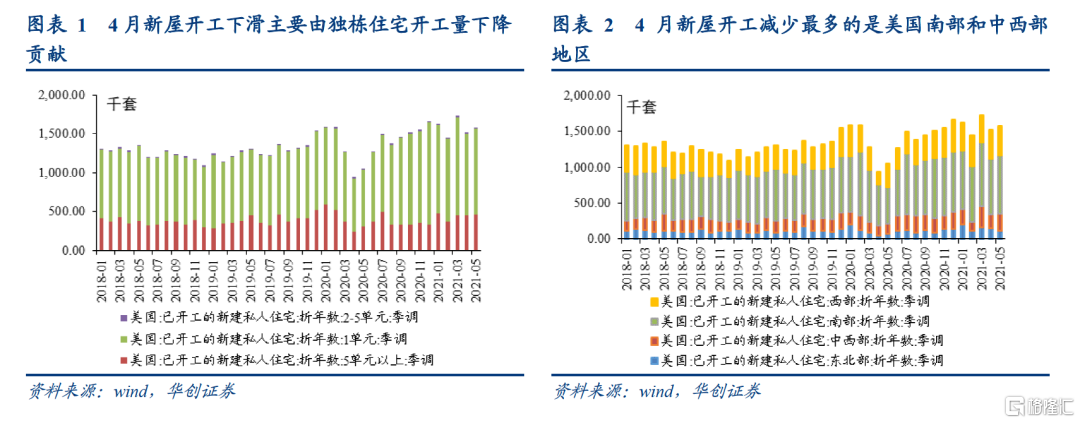 第二,从地区看,美国南部和中西部地区的开工量占总开工量的65%左右,4月两地区新开工的降幅贡献了总开工量降幅的101.4%。4月总的开工量环比下降20.8万套,南部地区下降了10.7万套,中西部地区下降了10.4万套,而东北部和西部地区合计增加了0.3万套。