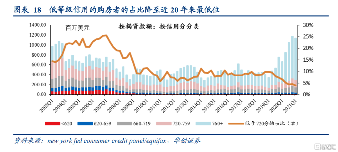 上文已经提到,美国房地产市场当下面临着需求内部分化的问题。那么,由此而来的中低端房和高端房的销量增速分化,是不是美国地产销售走弱的信号呢?从历史复盘看,不是的。姑且能与当下情况相比且数据可得的地产周期就是2002-2005年那轮美国地产周期。在上一轮地产周期中,由于次级贷款的泛滥,中低端房和高端房的销量是齐涨齐跌的,没有出现明显分化(此处以新房销售数据为例,二手房销售数据不可得)。在泡沫破裂时,大量中低端购房者的信贷崩盘是引发美国房地产螺旋式正反馈下跌的关键。但这一轮地产周期却呈现出高端房和中低端房销量增速分化的情景,我们认为,目前这种因需求分化而带来的销量分化,并不意味着美国地产走弱的开端,更多是体现出这一轮地产周期比2002-2005年那轮更“健康”(从按揭贷款的信用资质结构中能明显体现)。