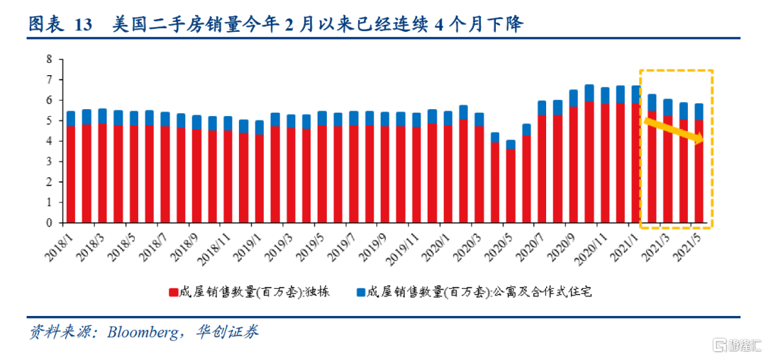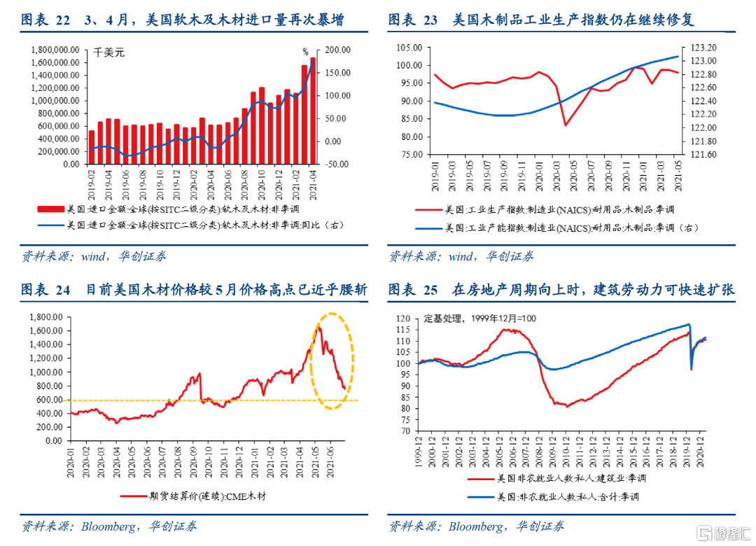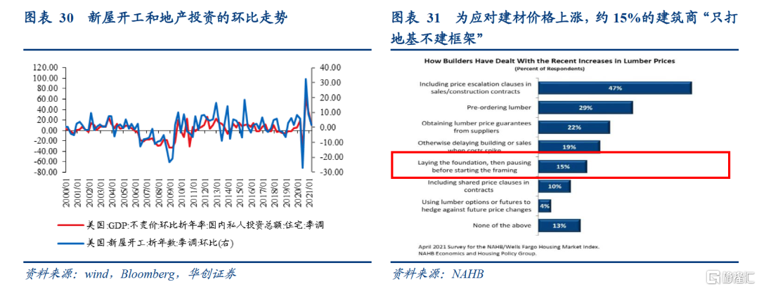 “先下”的逻辑:一是从施工量来看,新屋开工与地产投资的环比走势相关度较高,今年Q1新屋开工环比增长1.5%,Q1地产投资环比折年率为13.1%;今年4-5月新屋开工环比下降3.4%,或表明Q2地产投资增长不及Q1;二是从施工强度看,3月以来由于建材价格上涨,建筑商施工强度有所下降。据NAHB/富国住房市场指数4月调查数据,约有15%的建筑商通过“只打地基不建框架主体”的方式来应对软木等建材价格的上涨。这种开工也算在“新屋开工”数据统计中,但建筑商并没有进行后续建设,投入强度较正常时期偏低。