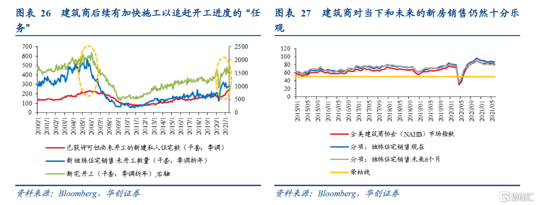 第三,建筑商后续有加快施工以追赶开工进度的“任务”。以2002-2005年历史走势看,已获许可但尚未开工的住宅数、已销售但尚未开工的独栋住宅数领先新屋开工数3-6个月左右,微观逻辑是,前两者越高,意味着后续建筑商就有加快住宅开工的“任务”。5月份,已获许可但尚未开工的住宅数(季调数)为23.8万套,仍在快速增长。已销售但尚未开工的独栋住宅数(季调折年数)为27.6万套,今年以来也保持稳定态势。从领先性看,新屋开工尚未进入下行通道。