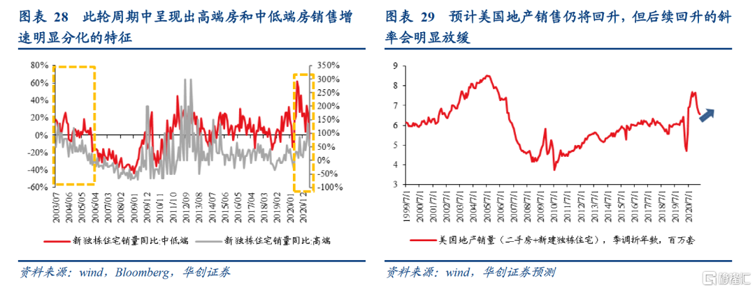 展望后续,我们预计美国地产销售仍将回升,全年走势呈“V”字型,但后续回升的斜率会明显放缓,全年地产销售增速将低于2020年(2020年销量增速为7.3%)。一是建筑材料短缺和涨价带来的成本端的房价上涨压力逐渐缓解[5],对中低收入群体购房需求的压制也将减少。二是建筑商将加快新房开工建设,驱逐令在6月到期后或将带来一波新上市二手房的“小放量”,新房和二手房供给将逐渐增多,可以放缓房价涨势及促进销售增长。三是按揭抵押贷款利率下半年虽可能小幅反弹但仍处于历史低位,还可以支撑地产销售继续增长。