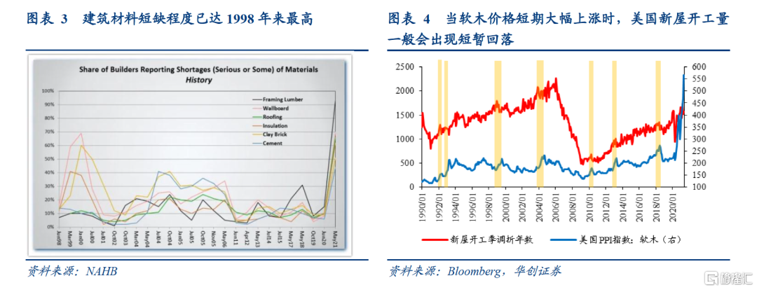 一方面,建筑材料短缺问题严重,直接制约了新房开工和建造。全美房屋建筑商协会(NAHB) 今年5月的调查显示,目前各类建筑材料的短缺程度在40~90%之间,比如有近90%的建筑商反馈面临软木短缺的情况;历史对比看,建筑材料短缺程度已达1998年来最高。住房建筑商正在一定程度上通过推迟新开工来应对建筑材料短缺[1]。