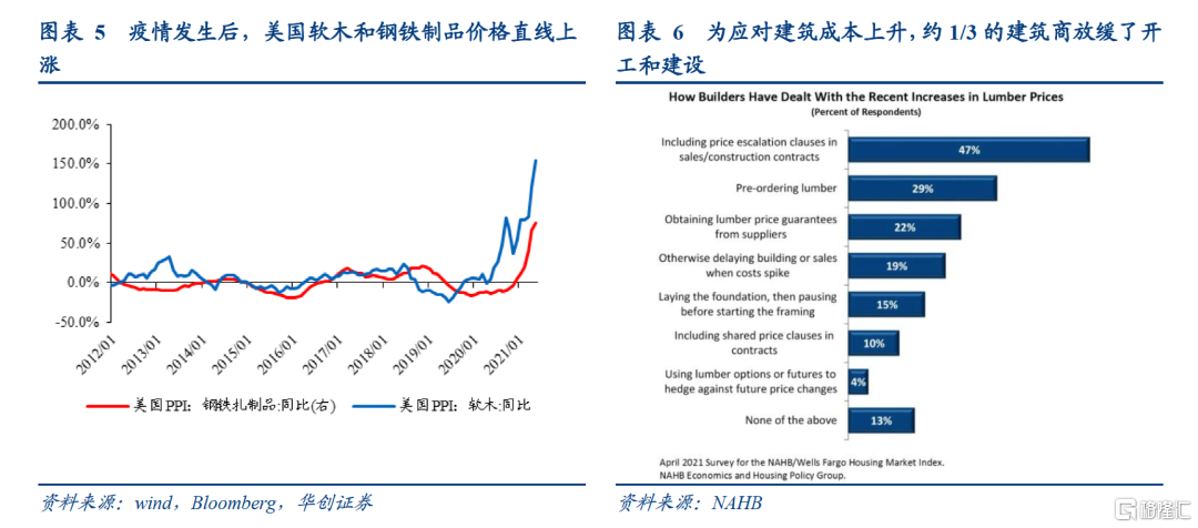 另一方面,建筑材料涨价也显著推高了建筑成本,为应对成本上升,约1/3的建筑商放缓了开工和建设。在美国独栋住宅建筑成本中,材料成本和人工成本大概六四开,软木和金属制品在材料成本中的占比分别约10%、12%。疫情发生后,美国软木和钢铁制品价格快速上涨,今年4月PPI软木价格指数同比上涨121%,PPI钢铁扎制品价格指数同比上涨67%,也就是说,仅软木和建筑钢铁制品价格的上涨就让建筑成本较去年同期提高了20%左右。为应对建筑成本上升,大约1/3的建筑商放缓了开工和建设。据NAHB/富国住房市场指数4月调查数据,有19%的建筑商通过推迟开工和暂缓销售来应对软木价格上涨,有15%的建筑商通过“只打地基不建框架主体”的方式来应对。