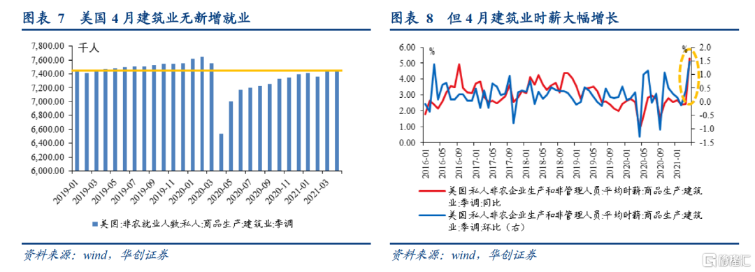 建筑工人短缺推高建筑成本并制约开工进度。上文已提到,建筑成本中,劳动力成本占比约四成。当下,美国建筑业的劳动力短缺,既推升了建筑成本又制约着开工进度。建筑劳动力市场的“价涨量不升”线索可佐证其“供不应求”的状况:劳动力数量方面,4月建筑业非农就业人数持平3月,没有新增就业,建筑业就业人数也尚未恢复至疫情前水平。薪资方面,4月建筑业时薪为30.2美元,同比增长5.3%,是近二十年来的最快增速;环比增长1.5%,是2015年以来增长最快的一个月。