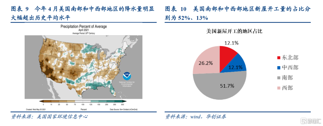 4月美国新屋开工走弱有一个偶发性的因素:4月美国南部和中西部地区降水较多,多雨天气扰乱了施工节奏。今年4月,美国南部和中西部地区的降水量大幅超出历史平均水平,而南部和中西部地区的新屋开工量在全美国的占比分别为52%、13%,多雨天气扰乱了施工节奏,4月南部和中西部地区新屋开工下降贡献了总开工量降幅的101.4%。