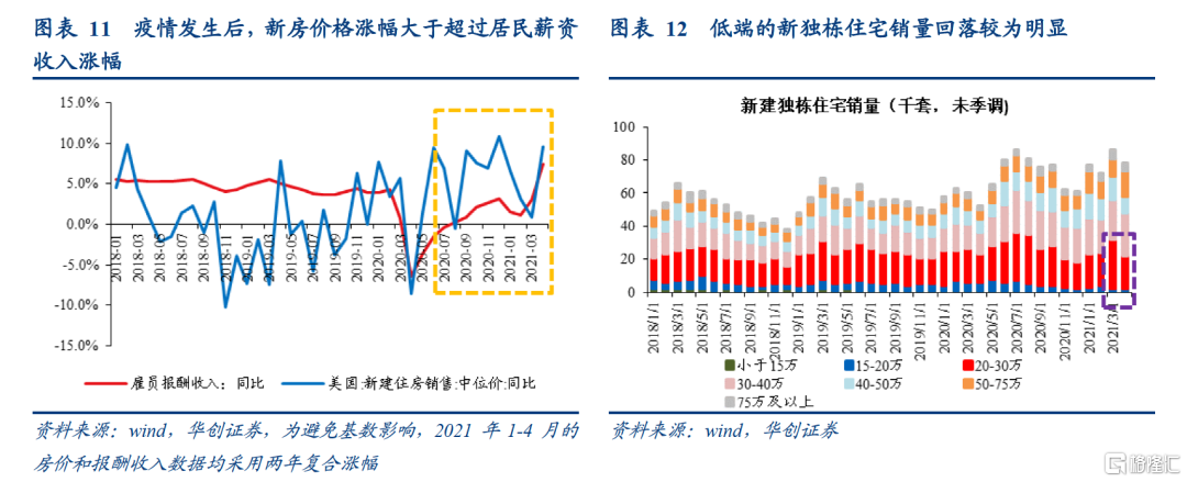 4月新独栋住宅的销售中价为37.24万美元,环比大涨11.4%,同比上涨20.1%(两年复合涨幅为9.6%)。而4月新独栋住宅实际销售量环比却减少了0.8万套,其中,20-30万的低端房(4月新房中价为37万美元)销量减少了1万套,贡献了新独栋住宅销量降幅的125%。从房价中枢涨幅快于居民薪资收入涨幅、高低端新房的销量分化这两点结合起来看,或许不是中低收入者因收入受损“不愿买房”,而是房价涨幅更快使得中低收入者“买不起房”。
