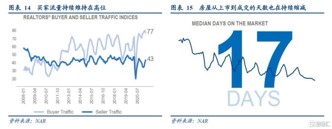 首先,我们认为目前美国房地产需求仍然较为旺盛,从不断上涨的房价、买家流量、经纪商收到的购房询价次数、持续缩减的成交天数等高频指标可以看出。不管是新房销售价格还是二手房销售价格均在持续上涨,建筑材料价格上涨和低库存虽助长了房价,但需求才是房价持续上涨的主要动力。从全美经纪商协会公布的买家流量和询价次数看,疫情发生后,在房屋经纪系统看房的买家流量不断增加,当下仍维持在高位,经纪商收到的购房询价次数也在提高,这意味着居民的购房热情并未下降。此外,房屋从挂牌上市到成交的天数也在持续缩减,也就是说,相比以前,现在的房子“更容易”卖出去。