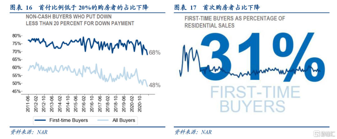 但是,需求内部也呈现分化状态:高收入者购房需求仍然旺盛,但中低收入者的购房能力和需求却在一定程度上被不断上涨的房价和严格的贷款发放条件所压制。不管是新房还是二手房销售,高端房销量一直在快速增长,表明高收入群体的购房需求仍然十分旺盛。但是快速上涨的房价中枢(涨幅超过居民薪资收入)、严格的按揭贷款发放条件也抑制了中低收入群体的购房能力和需求,这一点体现在三个方面:一是首次购房者的占比进一步下降,从去年4月的36%降至今年3月的34%,再降至5月的31%,今年以来下降幅度尤其明显;二是首付比例低于20%的购房者占比下降(中低收入群体购房更倾向于低首付比例);三是在严格的按揭贷款发放下,低等级信用的购房者占比从去年Q2的5.1%下降至今年Q1的3.9%,也是近20年来的最低水平。