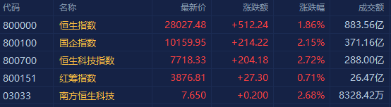 港股上午盘三大指数大涨,科技股强势崛起,致恒生科技指数涨2.72%报7718点,恒指涨1.86%报28027点,国指涨2.15%报10159点。南下资金半日净流入24.48亿港元,大市半日成交额为883亿港元。