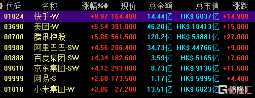 盘面上,大型科技股集体爆发,带动市场做多情绪大增。快手飙升10%,美团、腾讯均大涨逾5%,阿里巴巴、百度、京东均大涨超4%;汽车经销商股大幅拉升,区块链股、啤酒股、光伏股、港口航运股、煤炭股、汽车股现普涨行情;保险、石油股等权重均上扬;惟医美概念股跌幅靠前,纸业股、餐饮股走弱明显。