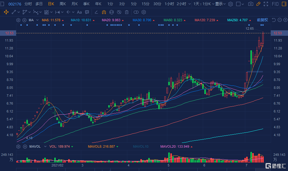 格隆汇7月14日丨江特电机(002176.SZ)拉升涨超7%,月内累计飙升逾60%。现报12.5元创2018年4月以来新高价,成交放大至22.7亿元,总市值214亿元。江特电机13日公告,预计2021年半年度归属于上市公司股东的净利润1.75亿元-1.85亿元,同比增长6214.73%-6575.57%。碳酸锂业务外部环境持续向好,下游需求增长,其销售价格同比有较大幅度上涨,公司碳酸锂业务产销较上年同期大幅增长,其营业收入及盈利能力均有较大幅度的增长。