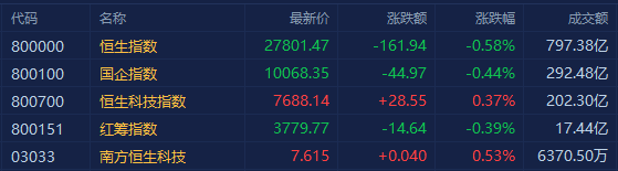 港股上午盘三大指数走势分化,恒指跌0.58%报27801点,国指跌0.44%报10068点,恒生科技指数涨0.37%报7688点。南下资金半日净流入12.56亿港元,大市半日成交额为797亿港元。