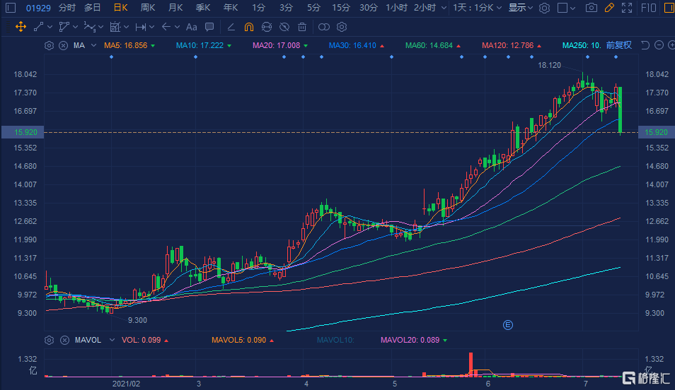 周大福(1929.HK)绩后大跌超9%。美银日前发研报指,周大福的股价由年初至今累升75%,该行将其评级降至中性,但上调目标价16%至19港元,相信集团的稳健增长预测已经反映,基于预期同店销售增长放缓及利润率压缩,相信其未来12个月的股票上涨空间有限。
