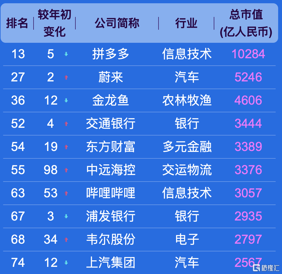 上海有拼多多、哔哩哔哩、万国数据、宝信软件、叮咚买菜等5家企业上榜。