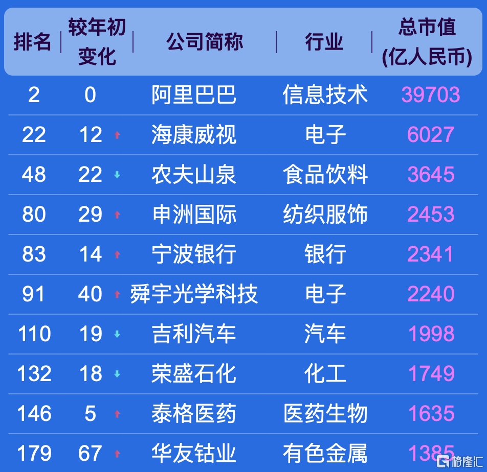 浙江的上市公司500强数量排全国第五,市值最高的企业为阿里巴巴,总市值为39703亿元。