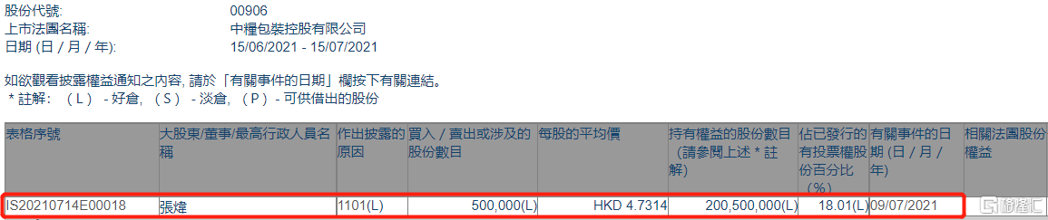 格隆汇APP获悉,根据联交所最新权益披露资料显示,2021年7月9日,中粮包装(00906.HK)获股东张炜在场内以每股均价4.7314港元增持50万股,涉资约236.57万港元。