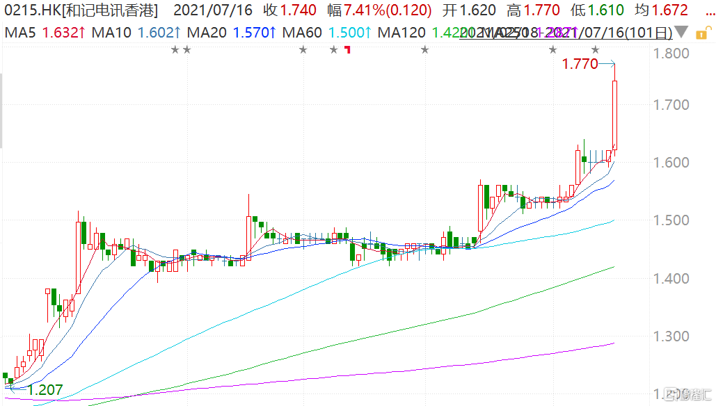 格隆汇7月16日丨和记电讯香港(0215.HK)尾盘拉升一度涨超9%至1.77港元,股价创逾2年新高,市值85亿港元。公司将于7月27日披露截至2021年6月30日止6个月的中期业绩及其发布,并考虑派付中期股息。