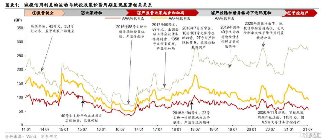 我们将2010年以来的城投监管政策分为6个主要的历史周期,其中2010年-2013年是监管政策框架构建阶段,城投处于发展起步期,快速加杠杆阶段,监管政策对城投债市场表现的影响不明显;2014年-2015年4月,城投监管政策收紧,但当时处于利率债大牛市,且部分城投债被认定为地方政府债务,“金边”属性浓厚,对冲了政策收紧对信用利差的影响;此后的四个历史周期,信用利差与政策松紧呈现出显著相关性。