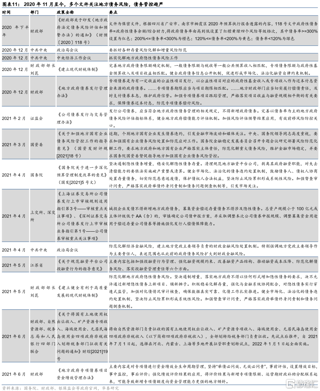 2020年11月至今,经济稳增长压力较小,债务管控趋严2020年11月至今,一方面城投带息债务快速增长、隐债化解中存在一定问题引发高层关注,财政紧平衡,防范债务风险成为新常态下的政府部门重要的目标;另一方面,我国疫情防控工作得力,经济财政收入大幅恢复,相对海外各国具有比较优势,宏观经济处于稳增长压力较小的窗口期,为宽松政策退出提供良好时机。多个文件发布管控地方债务风险,城投市场表现显著分化。