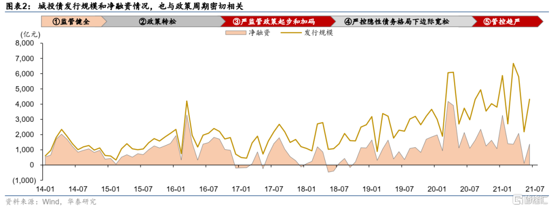 城投作为典型的逆周期行业,城投监管政策直接影响市场预期和融资环境,因此城投债的表现与城投监管政策松紧息息相关。城投监管政策收紧时,市场预期悲观,融资环境弱化,城投债信用利差趋于上行,发行规模下降、净融资萎缩甚至降为负值;城投监管政策宽松时,市场预期向好,融资环境好转,城投债信用利差趋于下降,发行规模上升,净融资规模呈大幅正值。