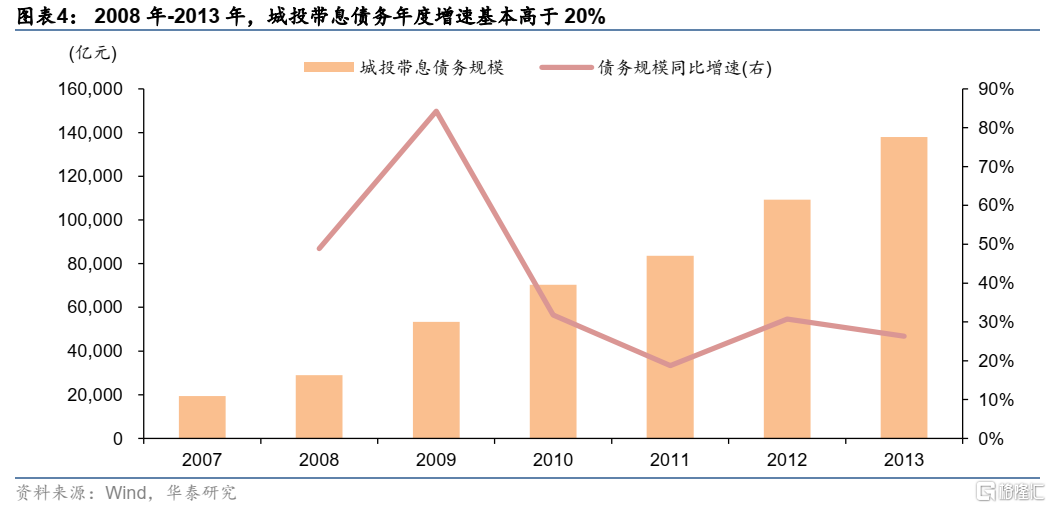 2008年起城投平台开始快速发展,发债体量和带息债务规模迅速增长。2008年“四万亿”为城投创造了快速增长的条件,在城市化快速推进、地方官员GDP考核导向的大背景下,2008年-2013年,城投带息债务快速增长,年度同比增速基本高于20%,2009年同比增速甚至达到84%,城投平台处于起步快速发展阶段。